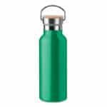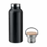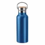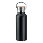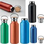 Double wall stainless steel insulating vacuum flask with lid in bamboo and carry handle.