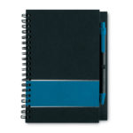Elegant notebook in black carton with colourful decorating band. 70 pages white lined paper. Includes a matching colour carton ball pen with blue ink.