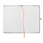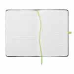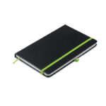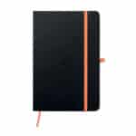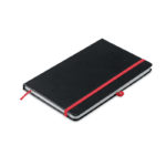 A5 notebook with PU cover and 96 lined pages with matching ribbon and elastic band. It has a pen loop and pocket on back cover.